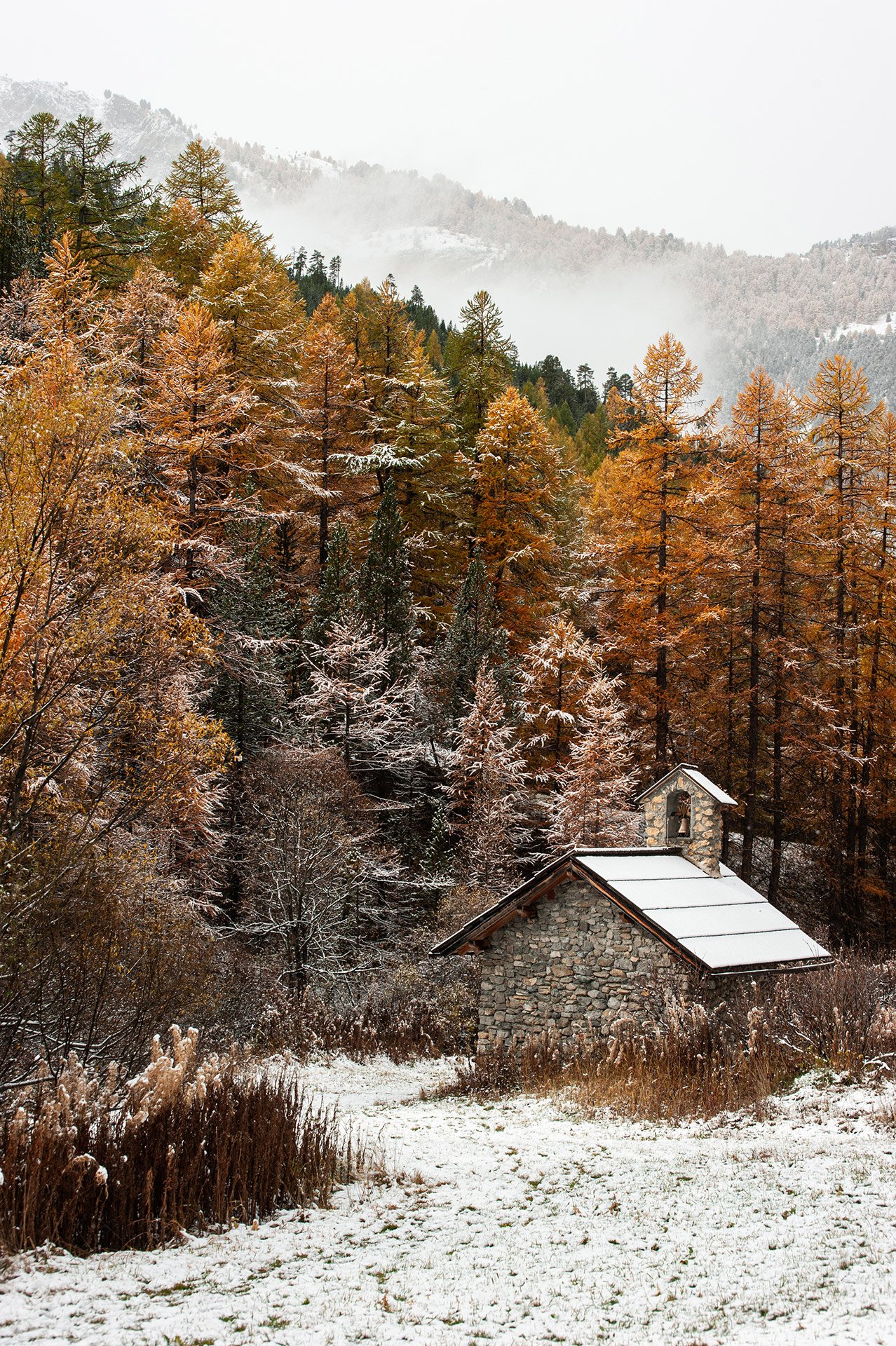 Parfois, les premières neiges recouvrent les sommets ou poudrent les alpages. Ces instants suspendus, à cheval entre deux saisons, mêlent le blanc immaculé à l’or des forêts : une alliance rare et précieuse. C’est à cette période que je suis le plus actif. Je sors dès que possible, surtout lorsque la météo se dégrade. Dormir en cabane, me charger davantage en matériel photo qu’en été, prendre le temps d’explorer et de me laisser inspirer : l’automne est une saison d’immersion totale.