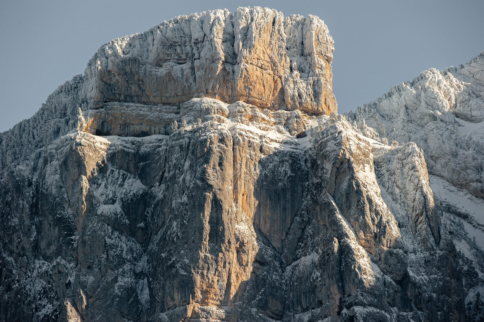 Le zoom 80-400 mm m’a permis de travailler une photographie de paysage plus intimiste, en isolant des portions de falaises dans la tempête, en jouant avec les couches de brume et les reliefs qui émergent à peine. Le vent, le froid et la neige participaient pleinement à l’expérience. Ces conditions exigeantes renforcent la dimension poétique des images : la montagne du Diois devient alors un songe d’hiver, fragile et mouvant.