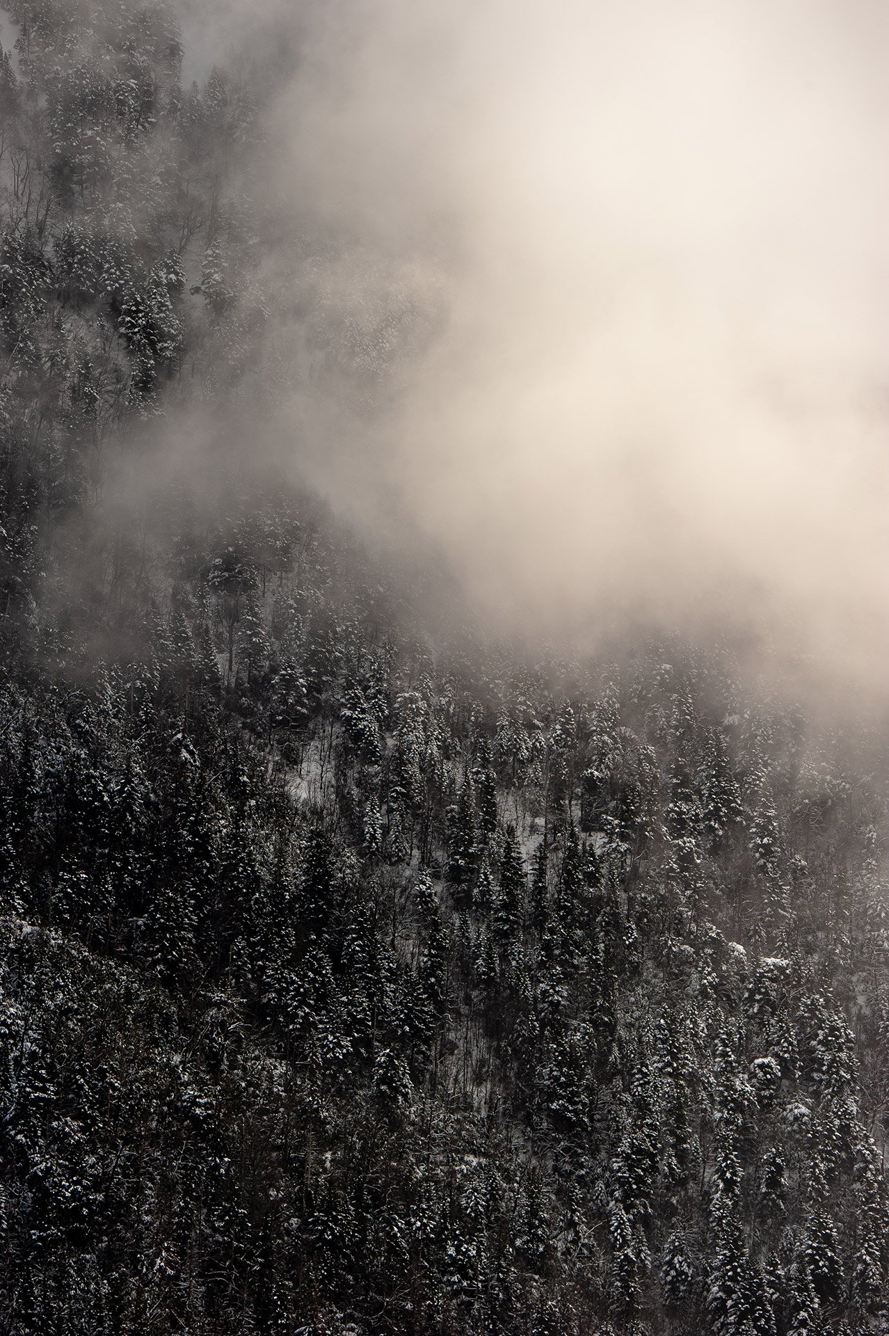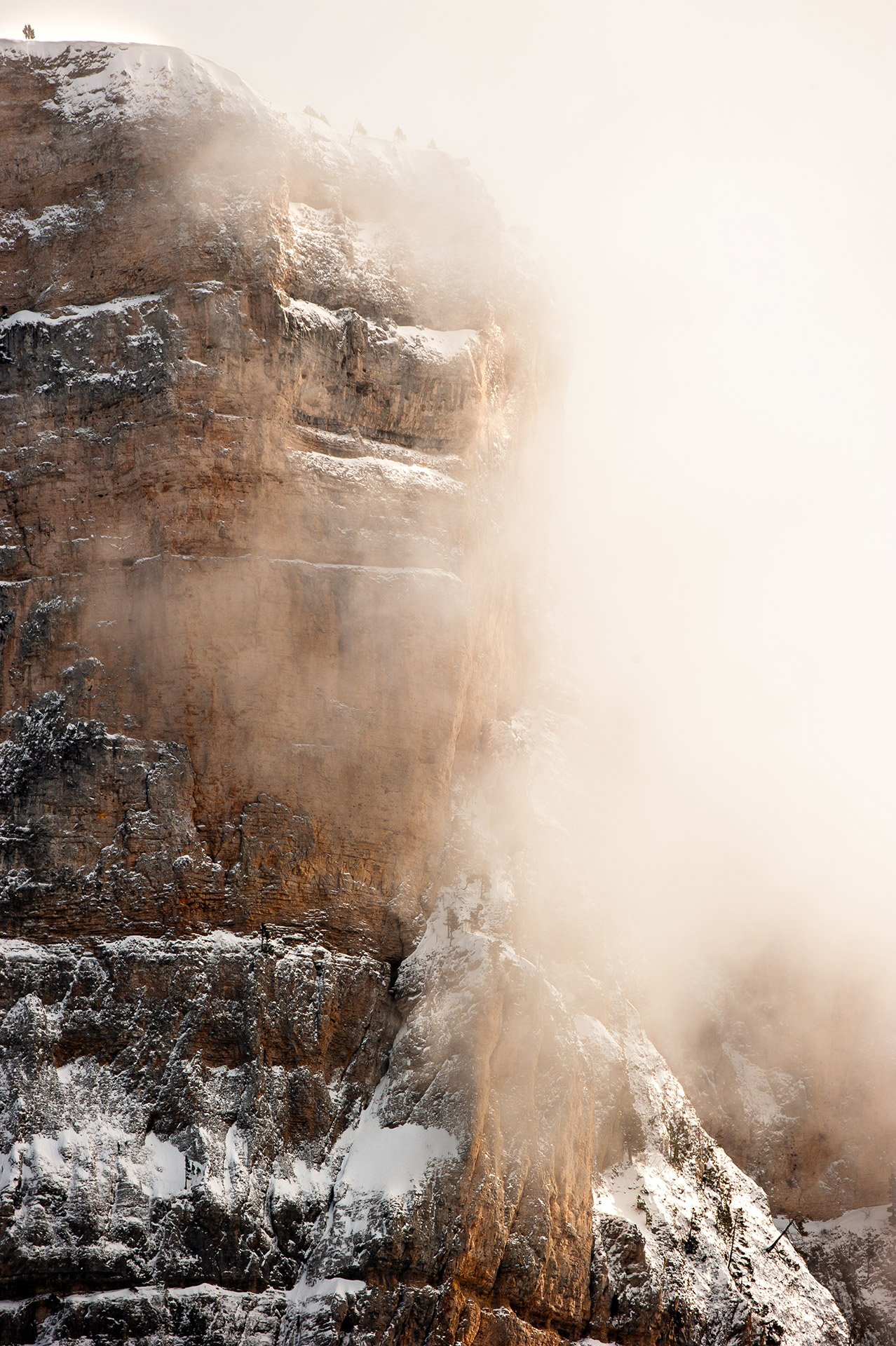 Les falaises du Vercors diois en hiver sont un terrain d’expression fascinant pour la photographie de montagne. Lorsque les nuages s’accrochent aux reliefs, que la brume efface les lignes et que la neige adoucit les contrastes, le paysage devient presque irréel. J’aime particulièrement ces instants où les nuages laissent apparaître seulement quelques fragments de roche ou de forêt, comme des apparitions furtives. Ces visions partielles créent des images très atmosphériques, presque fantomatiques, où la montagne semble flotter entre présence et disparition, comme une forteresse céleste.